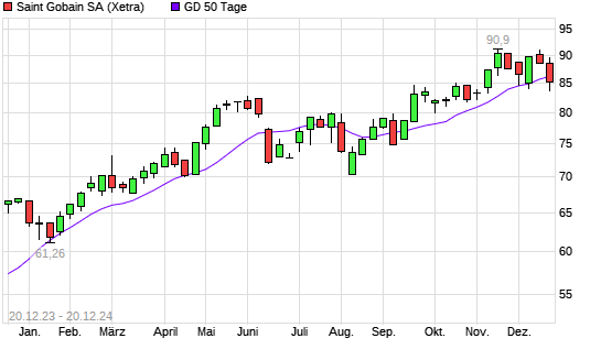 Mit dem Rücksetzer auf 85,72 EUR hat die Saint Gobain-Aktie am 19.12.2024 die 50-Tage-Linie nach unten gekreuzt.