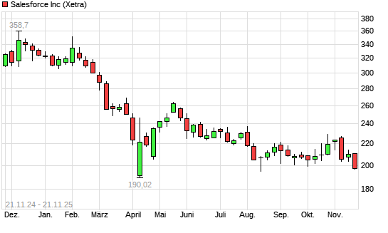 Mit dem Rücksetzer auf 195,00 EUR hat die Salesforce-Aktie (ISIN US79466L3024) am 20.11.2025 ein neues 12-Monats-Tief erreicht und damit den Kurs vom 19.11.2025 eingestellt.