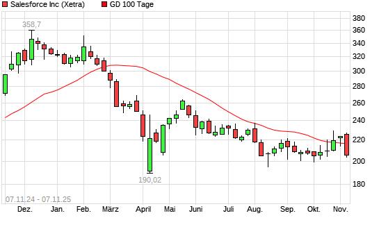 Mit dem Rücksetzer auf 207,25 EUR hat die Salesforce-Aktie am 06.11.2025 die 100-Tage-Linie nach unten gekreuzt.