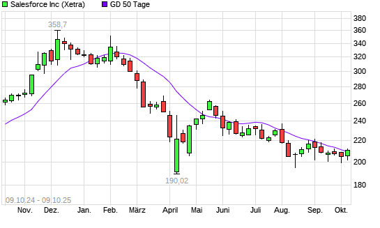 Mit dem Rücksetzer auf 204,00 EUR hat die Salesforce-Aktie am 08.10.2025 die 50-Tage-Linie nach unten gekreuzt.