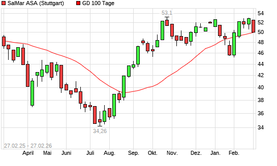 Mit dem Rücksetzer auf 50,10 EUR hat die Salmar ASA-Aktie am 26.02.2026 die 100-Tage-Linie nach unten gekreuzt.