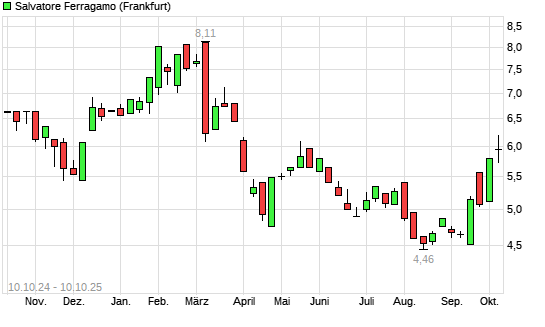 Mit dem Anstieg auf 6,19 EUR hat die Salvatore Ferragamo-Aktie (ISIN IT0004712375) am 09.10.2025 ein neues 6-Monats-Hoch erreicht und damit den Kurs vom 14.05.2025 eingestellt.