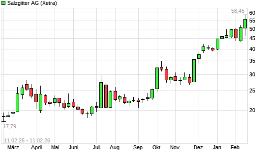 Mit dem Anstieg auf 53,80 EUR hat die Salzgitter-Aktie (ISIN DE0006202005) am 10.02.2026 ein neues 10-Jahres-Hoch erreicht und damit den Kurs vom 06.02.2026 eingestellt.