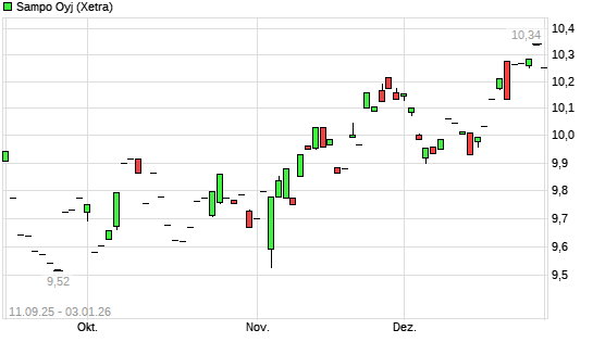 Mit dem Anstieg auf 10,34 EUR hat die Sampo-Aktie (ISIN FI4000552500) am 02.01.2026 ein neues All-Time-High erreicht und damit den Kurs vom 19.12.2025 eingestellt.