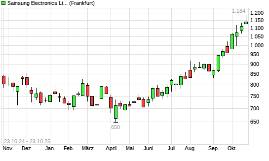 Mit dem Anstieg auf 1.184,00 EUR hat die Samsung-Aktie (ISIN US7960502018) am 22.10.2025 ein neues 12-Monats-Hoch erreicht und damit den Kurs vom 21.10.2025 eingestellt.