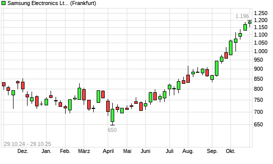 Mit dem Anstieg auf 1.188,00 EUR hat die Samsung-Aktie (ISIN US7960502018) am 28.10.2025 ein neues 12-Monats-Hoch erreicht und damit den Kurs vom 27.10.2025 eingestellt.