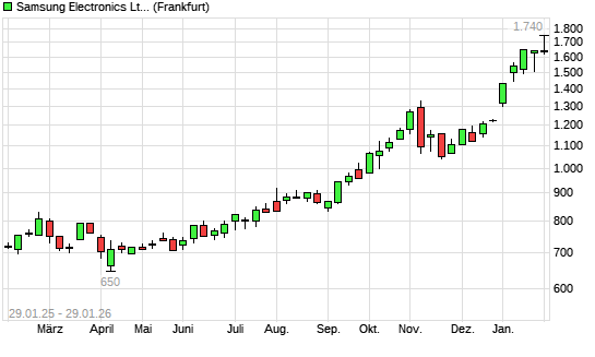 Mit dem Anstieg auf 1.734,00 EUR hat die Samsung-Aktie (ISIN US7960502018) am 28.01.2026 ein neues All-Time-High erreicht und damit den Kurs vom 27.01.2026 eingestellt.
