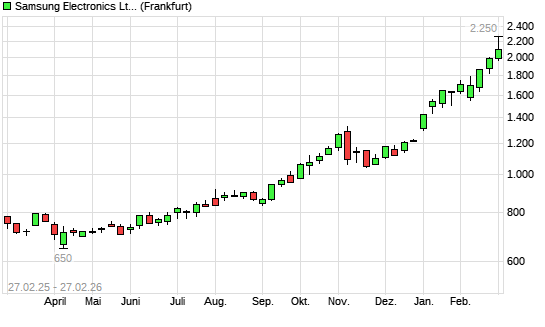 Mit dem Anstieg auf 2.230,00 EUR hat die Samsung-Aktie (ISIN US7960502018) am 26.02.2026 ein neues All-Time-High erreicht und damit den Kurs vom 25.02.2026 eingestellt.