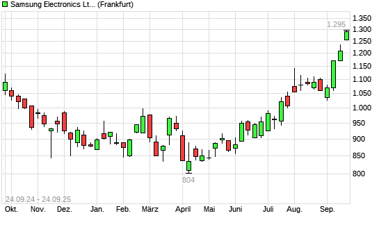 Mit dem Anstieg auf 1.290,00 EUR hat die Samsung Electronics St GDR-Aktie (ISIN US7960508882) am 23.09.2025 ein neues 12-Monats-Hoch erreicht und damit den Kurs vom 22.09.2025 eingestellt.
