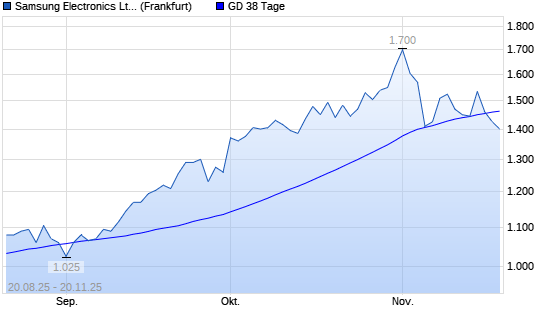 Mit dem Rücksetzer auf 1.425,00 EUR hat die Samsung Electronics St GDR-Aktie am 19.11.2025 die 38-Tage-Linie nach unten gekreuzt.