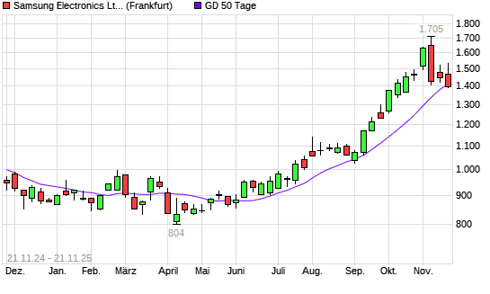Mit dem Rücksetzer auf 1.400,00 EUR hat die Samsung Electronics St GDR-Aktie am 20.11.2025 die 50-Tage-Linie nach unten gekreuzt.