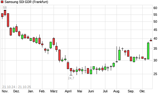Mit dem Anstieg auf 39,70 EUR hat die Samsung SDI-Aktie (ISIN US7960542030) am 20.10.2025 ein neues 6-Monats-Hoch erreicht und damit den Kurs vom 17.10.2025 eingestellt.