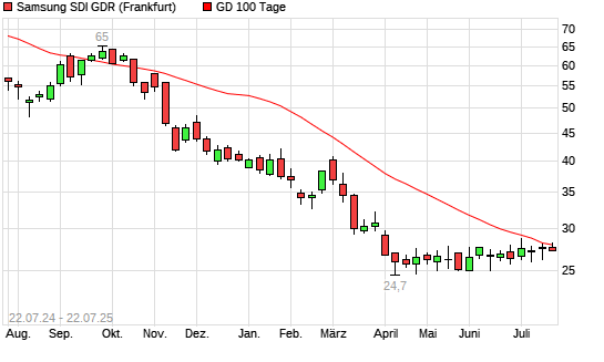 Mit dem Anstieg auf 28,10 EUR hat die Samsung SDI-Aktie am 21.07.2025 die 100-Tage-Linie nach oben gekreuzt.