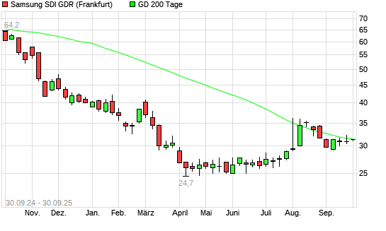Mit dem Anstieg auf 31,30 EUR hat die Samsung SDI-Aktie am 29.09.2025 die 200-Tage-Linie nach oben gekreuzt.