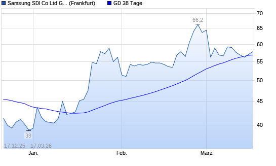 Mit dem Anstieg auf 57,00 EUR hat die Samsung SDI-Aktie am 16.03.2026 die 38-Tage-Linie nach oben gekreuzt.