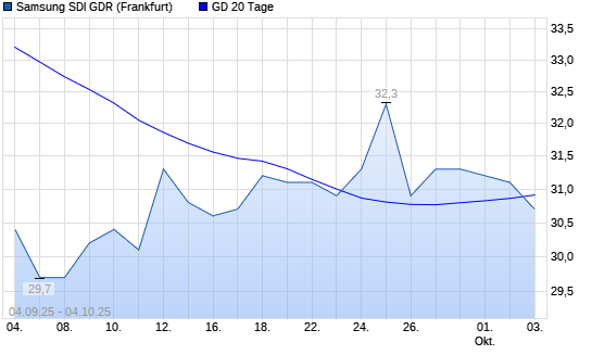 Mit dem Rücksetzer auf 30,70 EUR hat die Samsung SDI-Aktie am 03.10.2025 die 20-Tage-Linie nach unten gekreuzt.