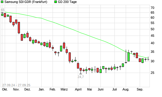 Mit dem Rücksetzer auf 30,90 EUR hat die Samsung SDI-Aktie am 26.09.2025 die 200-Tage-Linie nach unten gekreuzt.