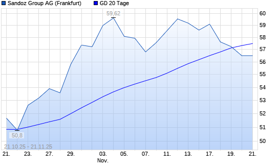 Mit dem Rücksetzer auf 56,50 EUR hat die Sandoz Group N-Aktie am 20.11.2025 die 20-Tage-Linie nach unten gekreuzt.