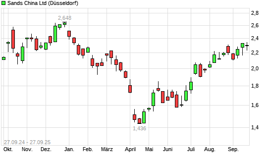 Mit dem Anstieg auf 2,35 EUR hat die Sands China-Aktie (ISIN KYG7800X1079) am 26.09.2025 ein neues 6-Monats-Hoch erreicht und damit den Kurs vom 25.08.2025 eingestellt.