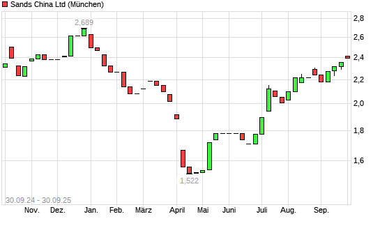 Mit dem Anstieg auf 2,42 EUR hat die Sands China-Aktie (ISIN KYG7800X1079) am 29.09.2025 ein neues 6-Monats-Hoch erreicht und damit den Kurs vom 26.09.2025 eingestellt.