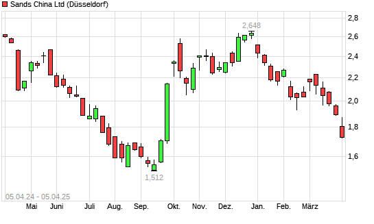 Mit dem Rücksetzer auf 1,78 EUR hat die Sands China-Aktie (ISIN KYG7800X1079) am 04.04.2025 ein neues 6-Monats-Tief erreicht und damit den Kurs vom 03.04.2025 eingestellt.