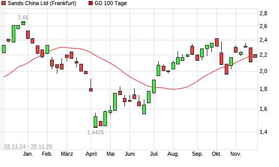 Mit dem Anstieg auf 2,21 EUR hat die Sands China-Aktie am 24.11.2025 die 100-Tage-Linie nach oben gekreuzt.