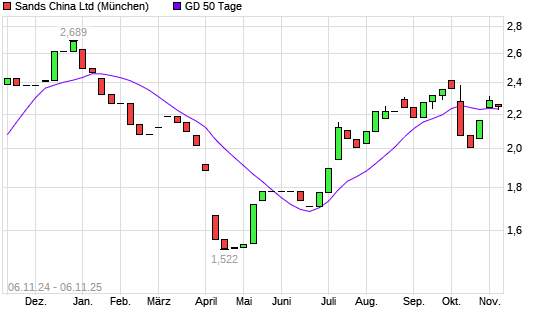 Mit dem Anstieg auf 2,22 EUR hat die Sands China-Aktie am 05.11.2025 die 50-Tage-Linie nach oben gekreuzt.