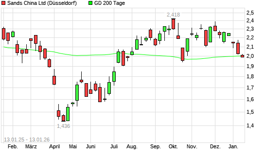 Mit dem Rücksetzer auf 2,02 EUR hat die Sands China-Aktie am 12.01.2026 die 200-Tage-Linie nach unten gekreuzt.