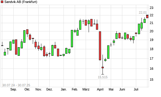 Mit dem Anstieg auf 21,85 EUR hat die Sandvik-Aktie (ISIN SE0000667891) am 29.07.2025 ein neues 3-Jahres-Hoch erreicht und damit den Kurs vom 28.07.2025 eingestellt.