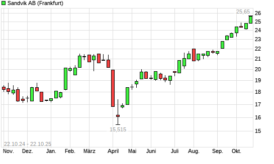 Mit dem Anstieg auf 25,65 EUR hat die Sandvik-Aktie (ISIN SE0000667891) am 21.10.2025 ein neues All-Time-High erreicht und damit den Kurs vom 06.01.2022 eingestellt.