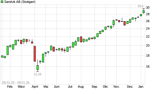Mit dem Anstieg auf 29,37 EUR hat die Sandvik-Aktie (ISIN SE0000667891) am 07.01.2026 ein neues All-Time-High erreicht und damit den Kurs vom 05.01.2026 eingestellt.