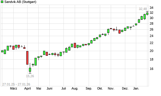 Mit dem Anstieg auf 31,81 EUR hat die Sandvik-Aktie (ISIN SE0000667891) am 26.01.2026 ein neues All-Time-High erreicht und damit den Kurs vom 23.01.2026 eingestellt.