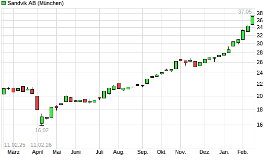 Mit dem Anstieg auf 35,92 EUR hat die Sandvik-Aktie (ISIN SE0000667891) am 10.02.2026 ein neues All-Time-High erreicht und damit den Kurs vom 09.02.2026 eingestellt.