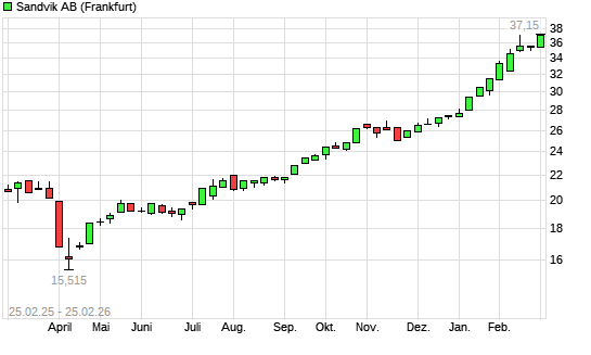 Mit dem Anstieg auf 36,84 EUR hat die Sandvik-Aktie (ISIN SE0000667891) am 24.02.2026 ein neues All-Time-High erreicht und damit den Kurs vom 11.02.2026 eingestellt.