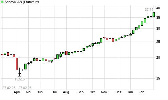 Mit dem Anstieg auf 37,24 EUR hat die Sandvik-Aktie (ISIN SE0000667891) am 26.02.2026 ein neues All-Time-High erreicht und damit den Kurs vom 25.02.2026 eingestellt.