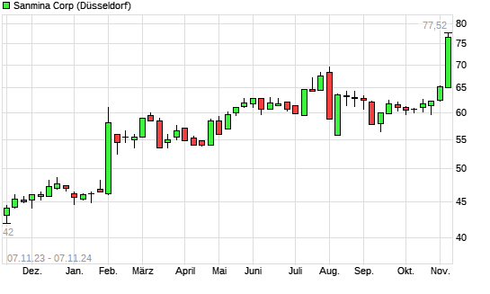 Mit dem Anstieg auf 77,70 EUR hat die Sanmina Corporation-Aktie (ISIN US8010561020) am 06.11.2024 ein neues 10-Jahres-Hoch erreicht und damit den Kurs vom 31.07.2024 eingestellt.