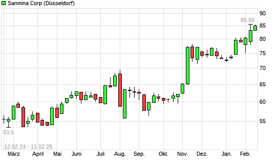 Mit dem Anstieg auf 86,14 EUR hat die Sanmina Corporation-Aktie (ISIN US8010561020) am 10.02.2025 ein neues 10-Jahres-Hoch erreicht und damit den Kurs vom 06.02.2025 eingestellt.