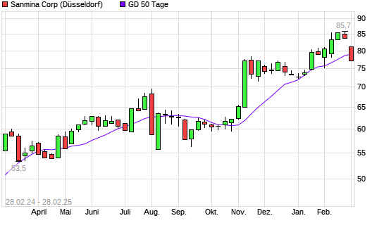 Mit dem Rücksetzer auf 78,44 EUR hat die Sanmina Corporation-Aktie am 27.02.2025 die 50-Tage-Linie nach unten gekreuzt.