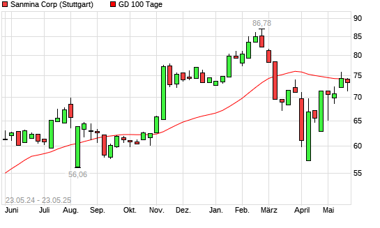Mit dem Anstieg auf 74,48 EUR hat die Sanmina Corporation-Aktie am 22.05.2025 die 100-Tage-Linie nach oben gekreuzt.Die Sanmina Corporation-Aktie befindet sich seit dem 07.05.2025 im langfristigen ...weiterlesen
