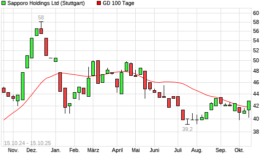 Mit dem Anstieg auf 42,80 EUR hat die Sapporo Holdings-Aktie am 14.10.2025 die 100-Tage-Linie nach oben gekreuzt.