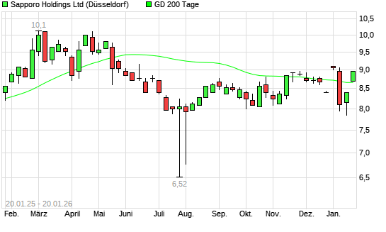 Mit dem Anstieg auf 8,85 EUR hat die Sapporo Holdings-Aktie am 19.01.2026 die 200-Tage-Linie nach oben gekreuzt.