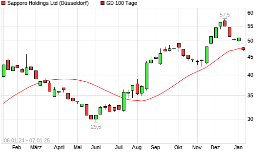 Mit dem Rücksetzer auf 48,40 EUR hat die Sapporo Holdings-Aktie am 06.01.2025 die 100-Tage-Linie nach unten gekreuzt.