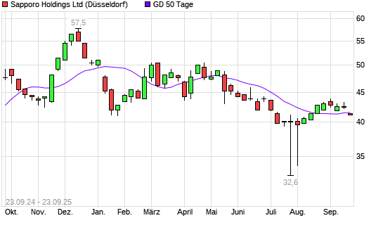 Mit dem Rücksetzer auf 41,60 EUR hat die Sapporo Holdings-Aktie am 22.09.2025 die 50-Tage-Linie nach unten gekreuzt.