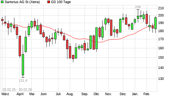 Mit dem Anstieg auf 188,20 EUR hat die Sartorius-Aktie am 19.02.2026 die 100-Tage-Linie nach oben gekreuzt.