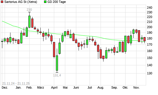 Mit dem Anstieg auf 175,80 EUR hat die Sartorius-Aktie am 20.11.2025 die 200-Tage-Linie nach oben gekreuzt.