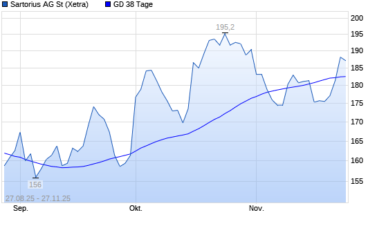 Mit dem Anstieg auf 186,80 EUR hat die Sartorius-Aktie am 26.11.2025 die 38-Tage-Linie nach oben gekreuzt.Die Sartorius-Aktie befindet sich seit dem 20.11.2025 im langfristigen Aufwärtstrend ...weiterlesen