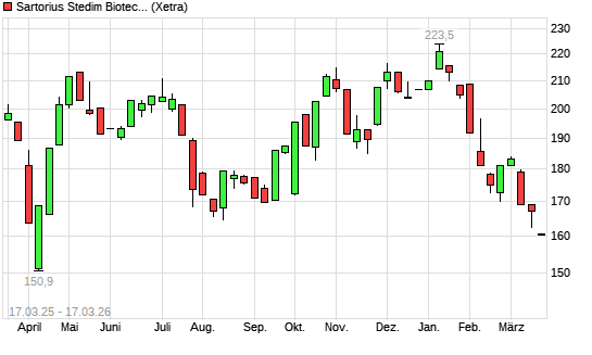 Mit dem Rücksetzer auf 159,90 EUR hat die Sartorius Stedim Biotech-Aktie (ISIN FR0013154002) am 16.03.2026 ein neues 6-Monats-Tief erreicht und damit den Kurs vom 13.03.2026 eingestellt.