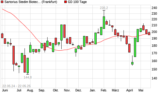 Mit dem Rücksetzer auf 196,40 EUR hat die Sartorius Stedim Biotech-Aktie am 21.05.2025 die 100-Tage-Linie nach unten gekreuzt.