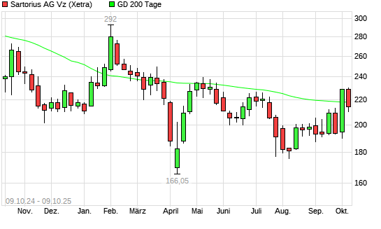 Mit dem Rücksetzer auf 213,90 EUR hat die Sartorius Vz-Aktie am 08.10.2025 die 200-Tage-Linie nach unten gekreuzt.