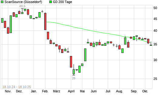 Mit dem Rücksetzer auf 34,80 EUR hat die ScanSource-Aktie am 17.10.2025 die 200-Tage-Linie nach unten gekreuzt.